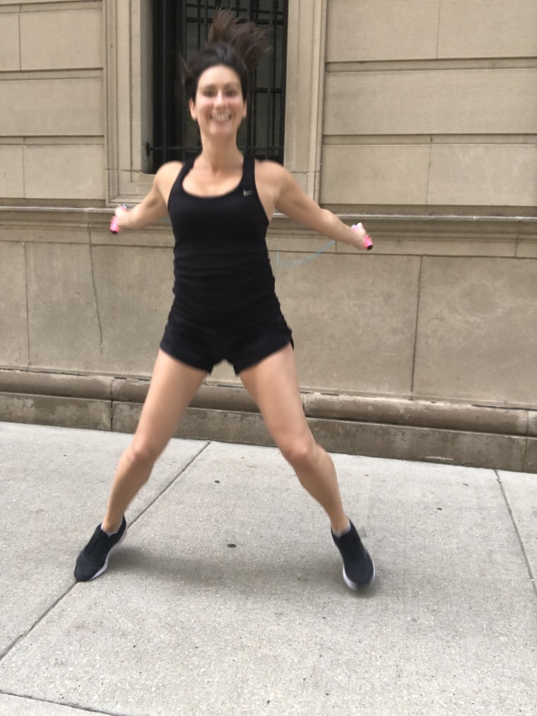 If you’re still getting the hang of it, drop the rope and do the jump rope routine with an imaginary jump rope instead. You will still get a cardio workout without the rope! Then, once you feel like you’ve mastered the form, you can try it again with the jump rope.