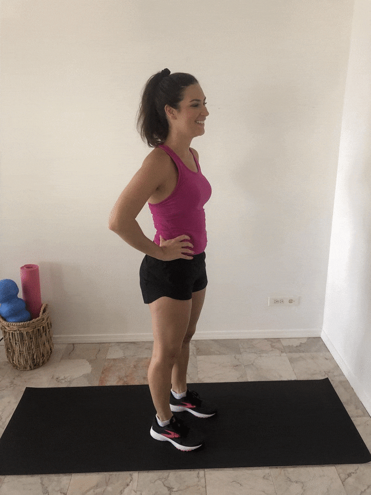 Stand with your feet as wide as your hips. Come up onto the toes to lift the heels off of the ground. Then lower the heels down. Repeat 10 times.