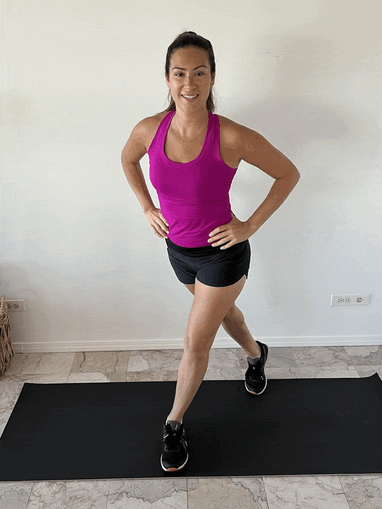 Stand with your feet as wide as your hips and your hands on your hips. Step your left foot back a few feet. This is your starting position. Bend the right knee so that it is over the right ankle, and bend your left knee so that the knee reaches down toward the ground. Look in the mirror and make sure your spine stays straight up and down and that you’re not leaning forward. Press down through the front heel to come up to the starting position. Repeat this 10 times then switch sides.