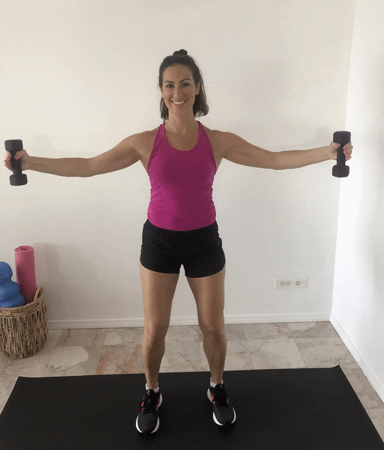 Hold the weights out to your sides at shoulder height, parallel to the floor. Relax the shoulders down, and then pull the arms toward the front of you as if you’re hugging a tree. Keep the elbows level with your arms — don’t let them dip down — and be conscious of the shoulders starting to raise up. If this happens, it means the weight is too heavy or you’re too fatigued, so you can either perform less reps or decrease the weights.