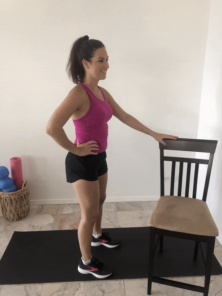Stand with your feet hip-width apart. Point your right foot in front of you and squeeze the quad. Lift the leg up almost as high as your hip, and then lower it down. Repeat 10 times and then switch to the left leg.