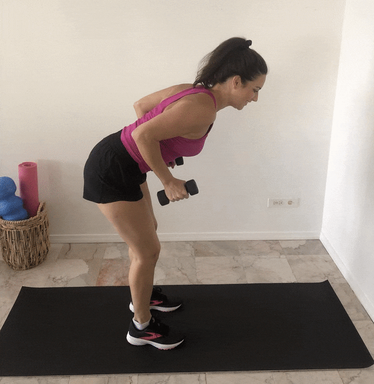 Holding a weight in each hand, hinge forward at the hips with a flat back. Hug your elbows in toward your sides, and kick the weight toward the back of the room by moving the arm below the elbow only. Feel the back of your arm tighten as you press the arm back, and then release it back to the starting position.