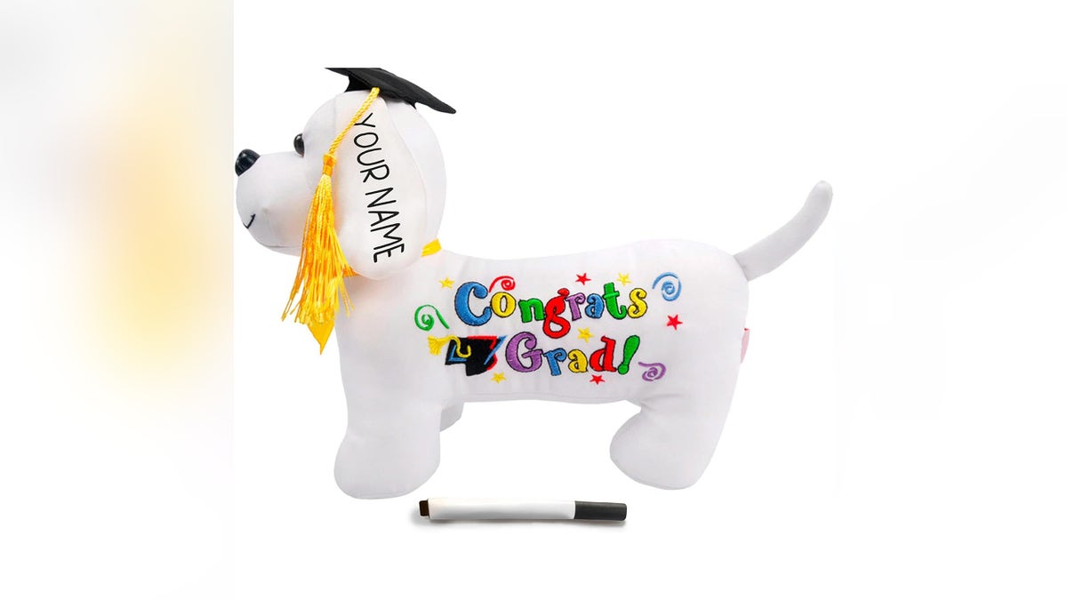 A gift that all of your kid’s friends can sign is the perfect memento for graduation. A white stuffed animal dog can be signed with felt markers by every kid in the class, creating a lasting gift that’s still fun. Find a personalized graduation dog at:
