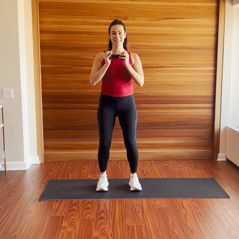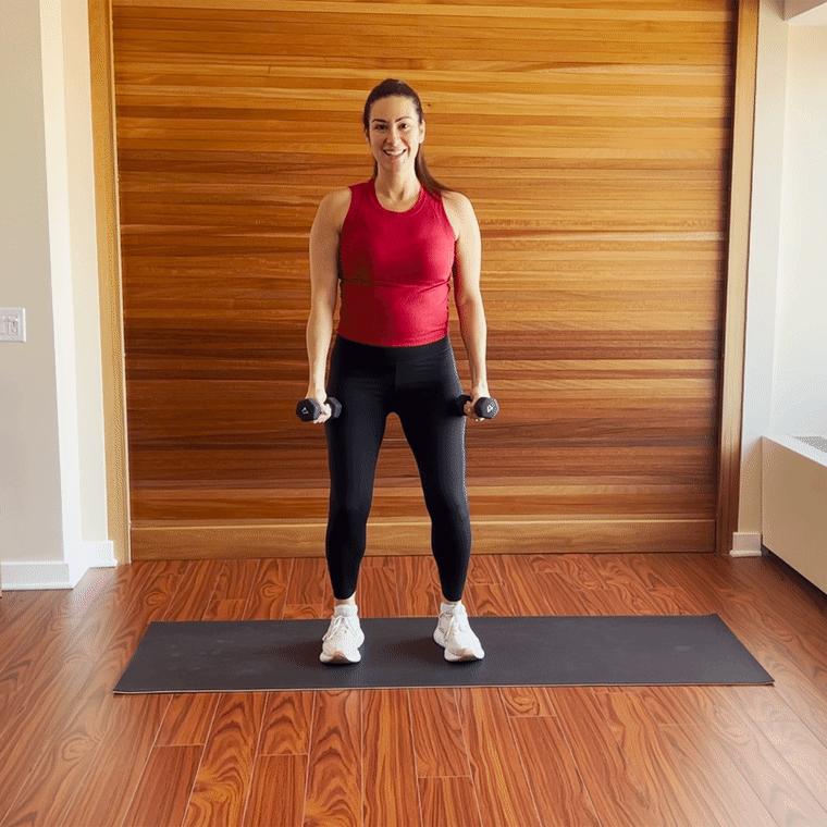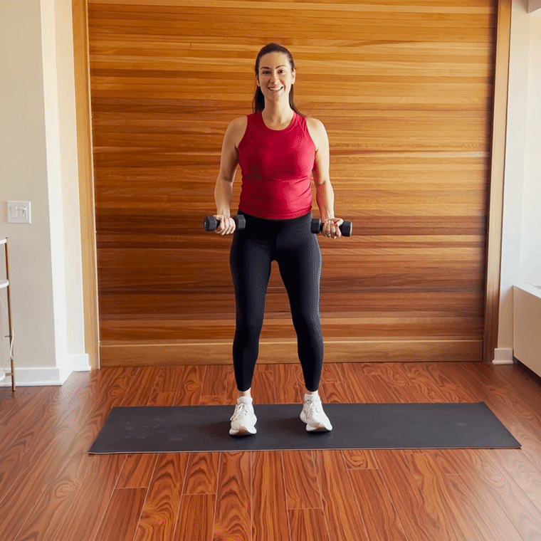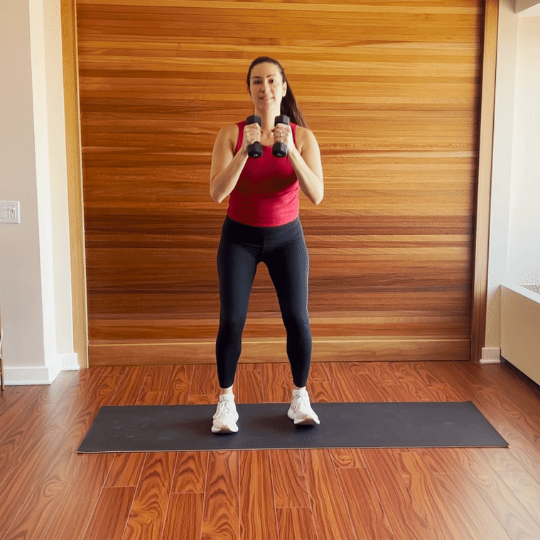Hold a dumbbell in each hand and bring your arms out to your sides at shoulder height, parallel to the floor. Relax the shoulders down, and then pull the arms toward the front of you as if you’re hugging a tree. Keep the elbows level with your arms — don’t let them dip down — and be conscious of the shoulders starting to raise up. If this happens, it means the weight is too heavy or you’re too fatigued, so you can either perform less reps or decrease the weights. Repeat 10 times.
