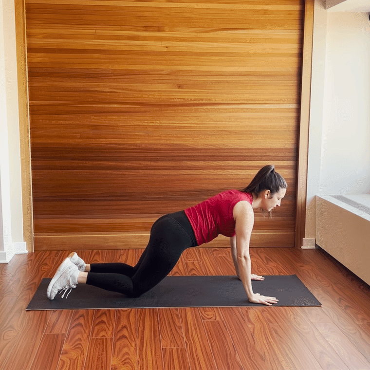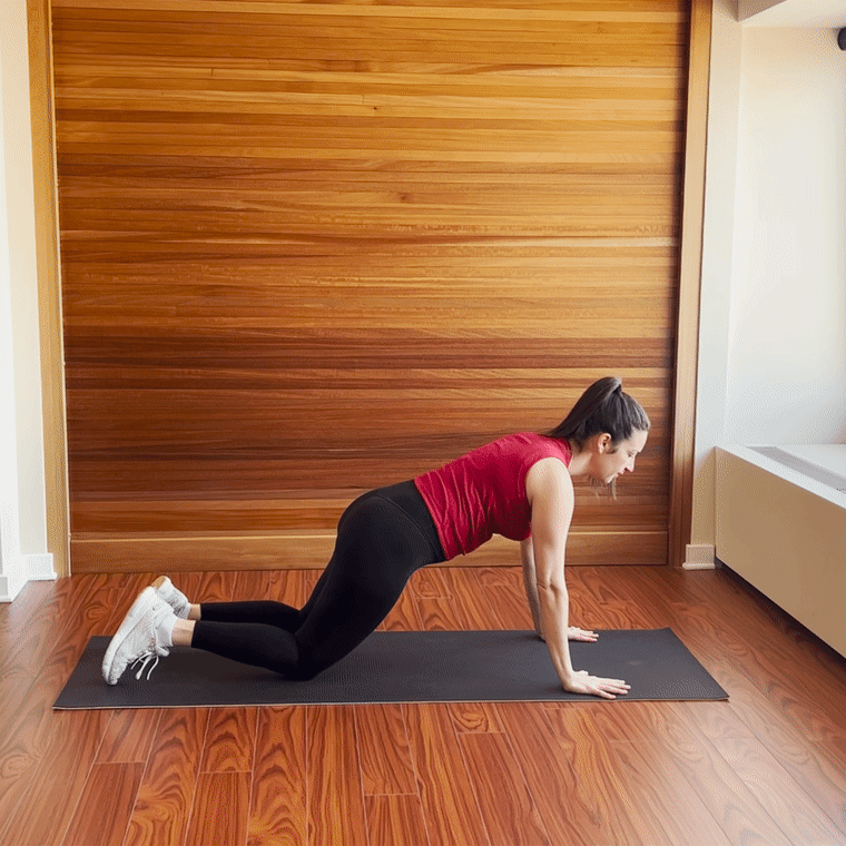 Come onto your hands and knees. Place your shoulders over your wrists and your hips over your knees. Walk your hands forward about a foot and bring your shoulders forward so that they stay over your wrists. Pull your navel in toward your spine and bend your elbows out to the side to lower down into a pushup. Press down through the palms of the hands to come back up to your starting position. Repeat 10 times.