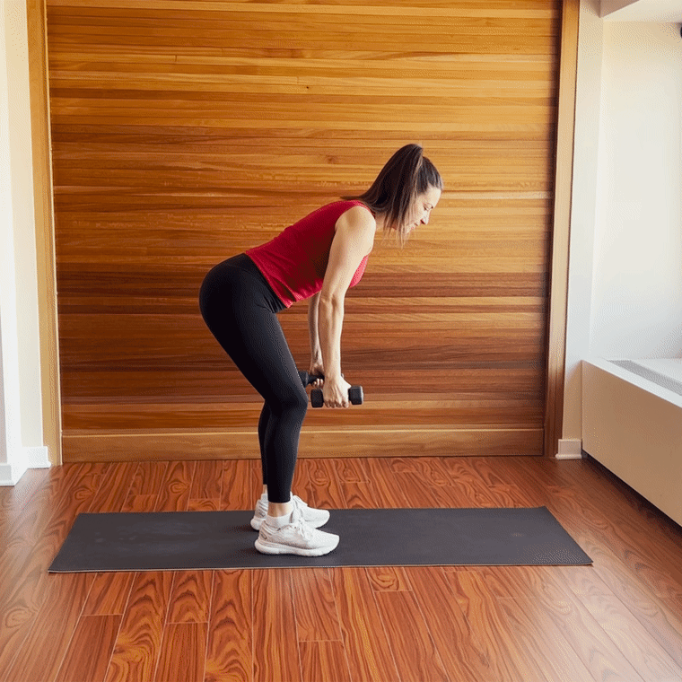 Hold a dumbbell in each hand with feet shoulder width apart and a slight bend in the knees. Hinge at your waist, leaning forward to a 45-degree angle, and let your arms reach down toward the floor. Squeeze your shoulder blades together, pulling the dumbbells out to the sides as high as your shoulders. Return to the starting position. Repeat 10 times.