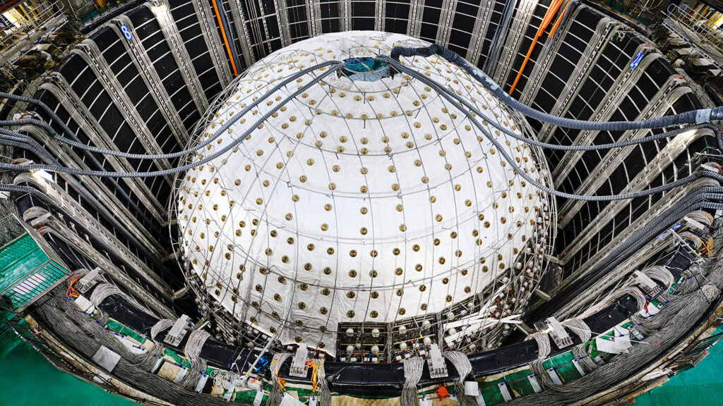 At the heart of the detector, located 700 meters underground in China, sits a roughly 35-meter-wide acrylic sphere. It will be filled with 20,000 metric tons of liquid scintillator, which emits light in response to particles produced when a passing antineutrino interacts with a proton in the liquid. Tens of thousands of photomultiplier tubes will eye the scintillator for antineutrino-induced glimmers. Surrounding the sphere, water will fill a cylindrical pit to help filter out subatomic particles that are not antineutrinos but might mimic them. Scientists began filling this pit with water on December 18.