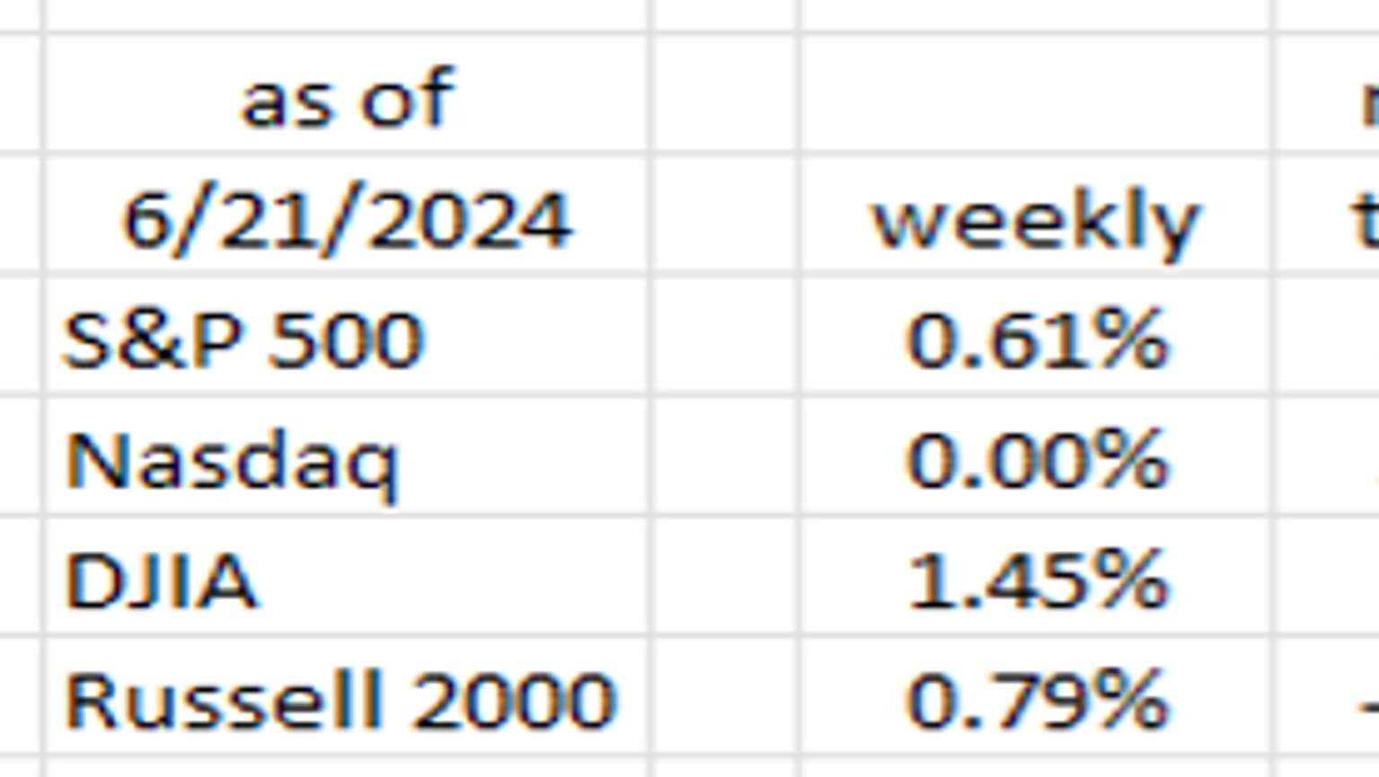 Equity markets were subdued this week with the S&P 500 and Nasdaq held at bay by a break in the upsurge in the price of Nvidia (NVDA) which, on Thursday and Friday (June 20 and 21) gave back about -6.6% in its price (but still up 155% year to date!).