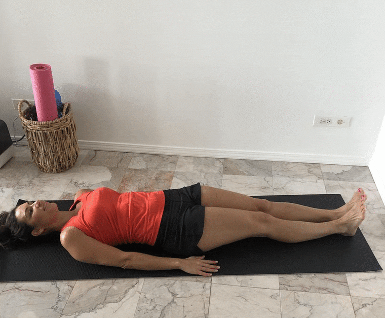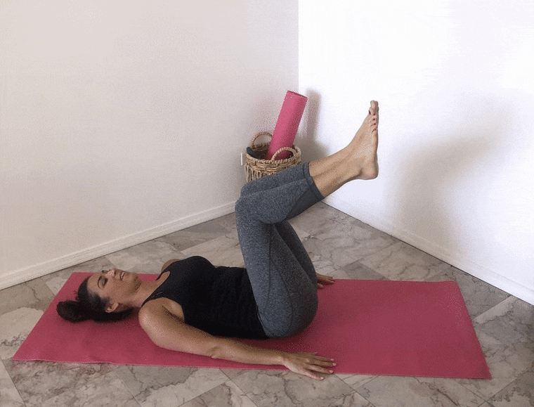 A pelvic tilt is always a great way to begin a set of ab exercises in order to wake up the core and practice engaging the proper muscles. Lie on your back, bend your knees and place your feet flat on the floor. Make sure your feet are hip-width apart and your arms are reaching down towards your feet. Then take a deep breath, and feel your lower back arch slightly off of the ground. Then exhale as you tilt your pelvis forward and press your low back into the ground. Pull in the naval toward your spine as if you’re zipping into a tight pair of pants. Release and repeat 10 times.