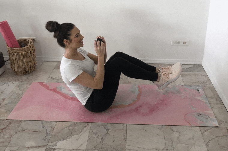 Sit on the ground with your knees bent and feet either hovering above the floor or resting on the ground. Tilt your upper body backward to a 45-degree angle (this will feel like you are at the top position of a situp). Hold a dumbbell in both hands, squeeze your shoulder blades together and pull your shoulders away from your ears. Keeping the dumbbell in front of your chest, twist your torso to the right, tapping the dumbbell on the floor, then move back through center and twist to the left, tapping the dumbbell on the floor. Repeat 5 times on each side. For a modification, perform the move without a dumbbell.