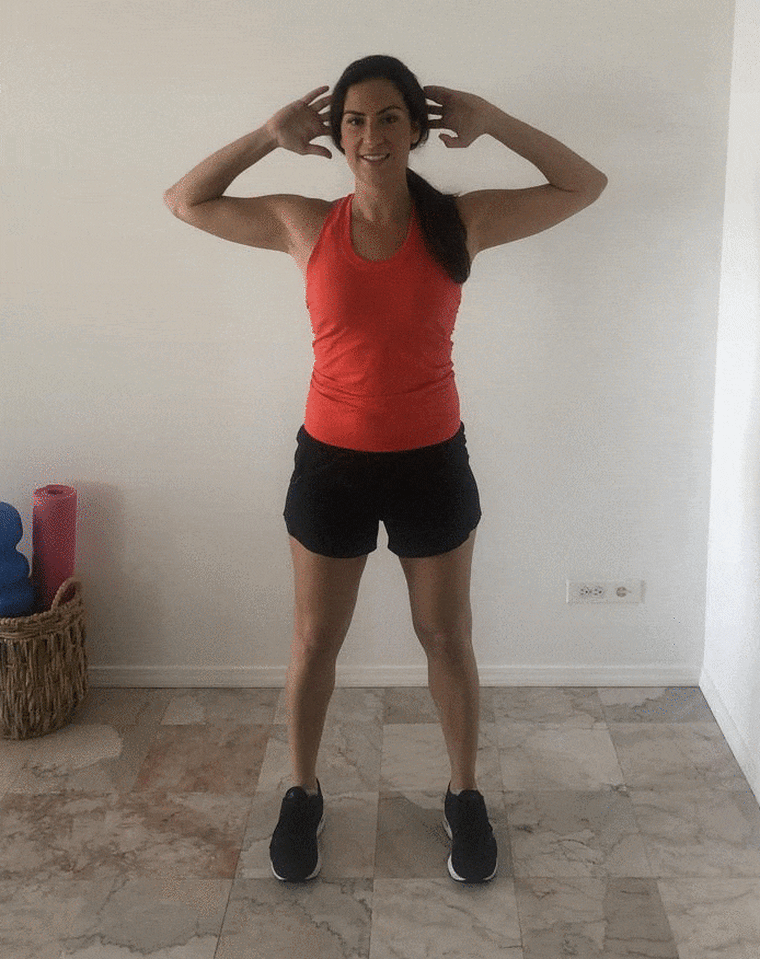 This move works your lower core muscles. Stand with your feet hips-distance apart and your arms at your sides. Place the right hand on the back of the head like you would for a crunch. Begin moving your torso down toward the left, crunching the left oblique, so that your right elbow reaches up toward the sky. Reach your left hand down toward the ground. Hold this position, squeezing the abs, then switch sides.