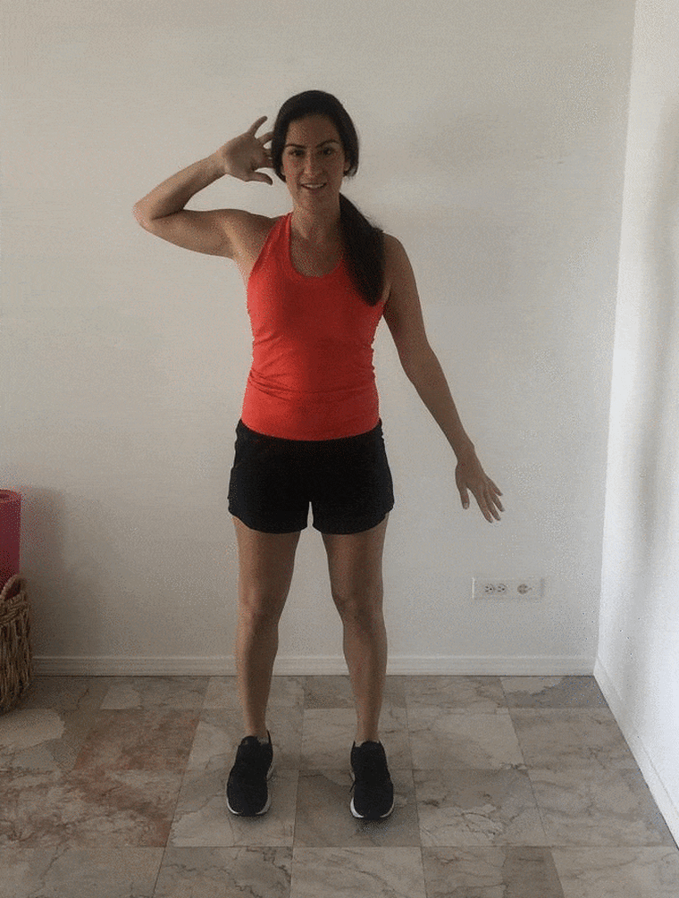 Lie down face up while keeping your shoulders and low back flat on the floor. Keep your arms straight as you lift them up towards the sky until they are straight above your shoulders. Then, lift your legs while bending your knees into a tabletop position, stacked over your hips at a 90-degree angle. Exhale and engage the core while you lower the opposite arm and leg (left leg and right arm), hovering them above the floor. Return to the starting position and repeat on the opposite side (right leg and left arm). Repeat five times on each side.