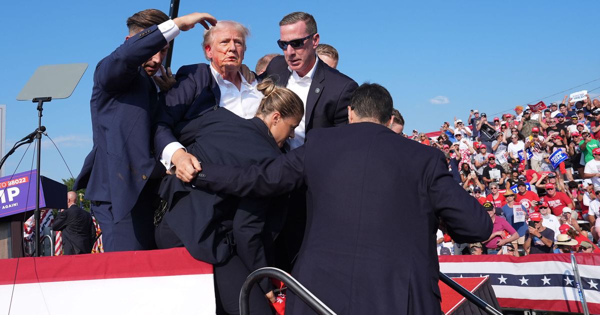 According to video footage from the Trump rally shooting, several shots rang off minutes into his speech, prompting him to duck as Secret Service agents came to shield him before taking him off the stage.