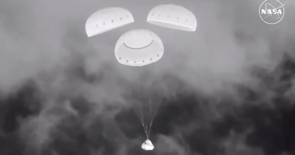 Six hours after departing the International Space Station, Starliner parachuted into New Mexico’s White Sands Missile Range, descending on autopilot through the desert darkness.