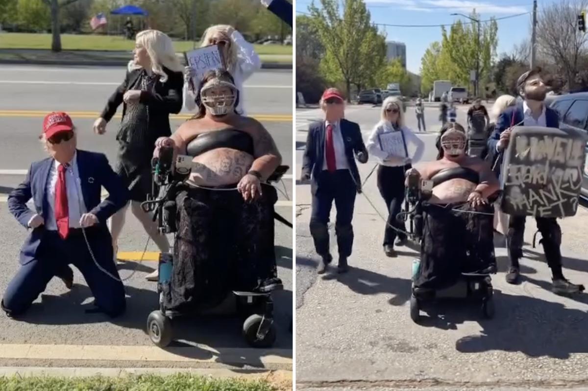 Attorney General Pam Bondi and White House press secretary Karoline Leavitt dress-alikes are also represented in the merry little band of dancing demonstrators, along with an unidentified man dressed in strappy bondage gear.