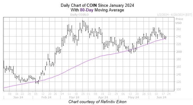 Even further, Coinbase Global stock’s Schaeffer’s Volatility Scorecard (SVS) stands at a 71 out of 100, indicating the stock exceeded option traders’ volatility expectations in the past 12 months — a boon for premium buyers.