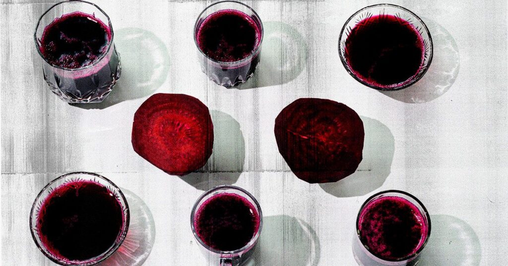 Under otherwise strict dietary guidance, the participants consumed two 2.3-ounce bottles of concentrated beetroot juice at the start of the study, followed by one bottle daily for one week. Each bottle delivered the same level of nitrates as three large beets.