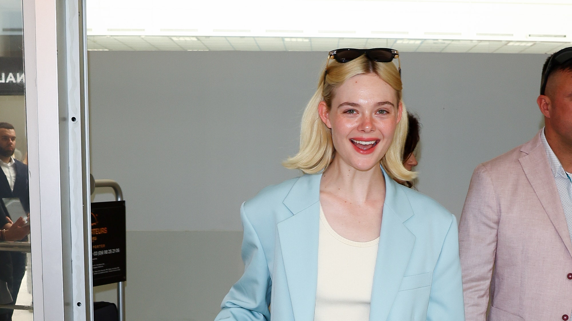 Forget about wearing sweatpants on this plane, Cannes attendees deplaned in a variety of travel fits, ranging from denim to suiting. Model Soo Joo Park opted for a black minidress and knee-high boots that matched her bright blue hair; Uma Thurman wore a white jumpsuit; Fanning looked ever the businesswoman in an aqua-colored suit.
