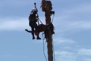 - Dramatic footage shows daring aerial rescue of worker stranded atop towering palm tree