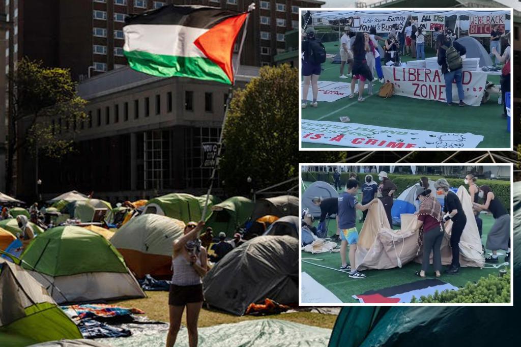 The defiant demonstrators — members of Columbia Students for Justice in Palestine — set up camp on the Manhattan campus’ south lawns alongside a giant white party tent already in place for the alumni event festivities that end Saturday.
