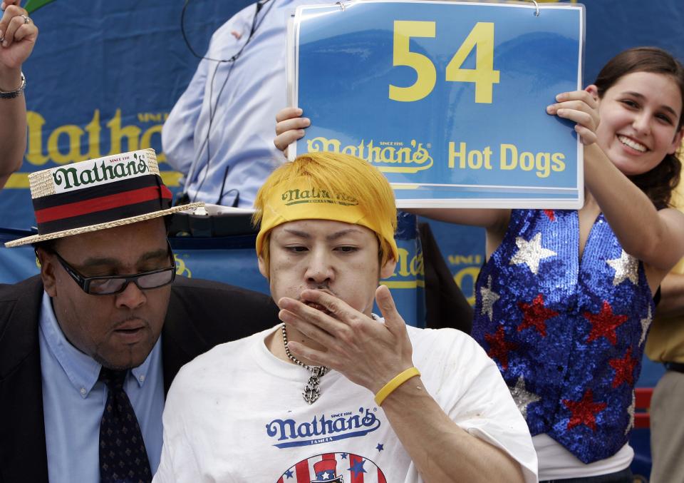 Kobayashi jumpstarted his career in 2000 during an appearance on the Japanese variety show “TV Champion,” where he consumed 16 bowls of ramen in one hour. He set a world record at the 2001 Nathan’s Coney Island Hot Dog Eating Contest, held annually on July 4, by eating 50 hot dogs in 12 minutes. (The previous record at the time was 25⅛ hot dogs). He won the Mustard Yellow Belt six consecutive years from 2001 to 2006.