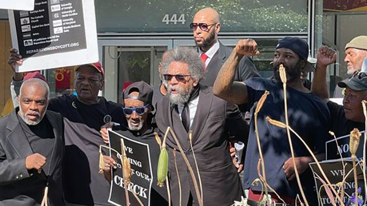 EXCLUSIVE: Unaffiliated presidential candidate Cornel West joined a group of protesters picketing in front of Wells Fargo Bank in downtown Washington, D.C., on Tuesday afternoon – bolstering their demands for reparations.Â