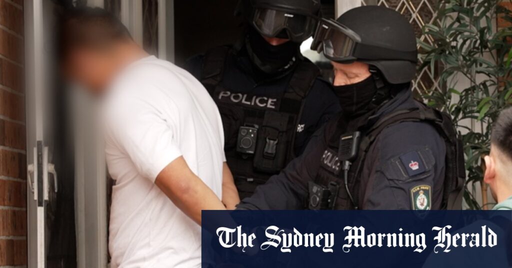 NSW Police arrest a man at Hassall Grove over public transport offences last month.Credit: NSW Police