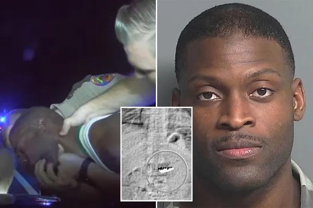 Glider, 32, began thrashing around as three astonished officers wrestled him to the ground and demanded he “open his mouth,” according to the clip.