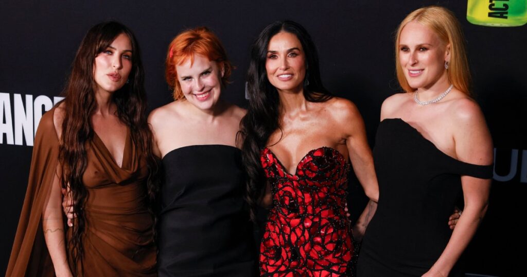 Rumer, 36, wore an off-the-shoulder black gown, while Moore and ex-husband Bruce Willis’ youngest daughter, Tallulah, 30, opted for a strapless black dress. Scout, 33, meanwhile, looked ethereal in a floor-length brown dress with draping sleeves.