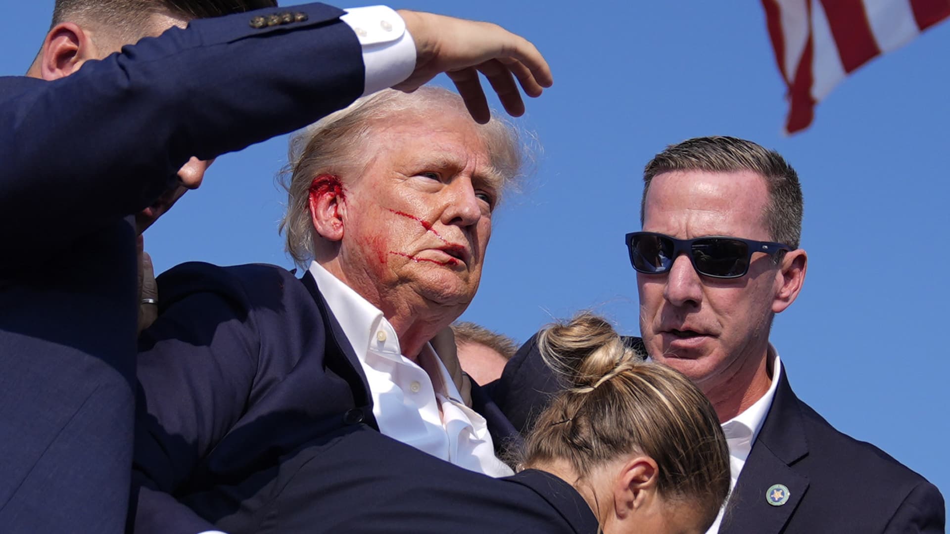 Photographers captured images of former President Donald Trump with thin streaks of blood on his face, as well as the chaos that followed.
