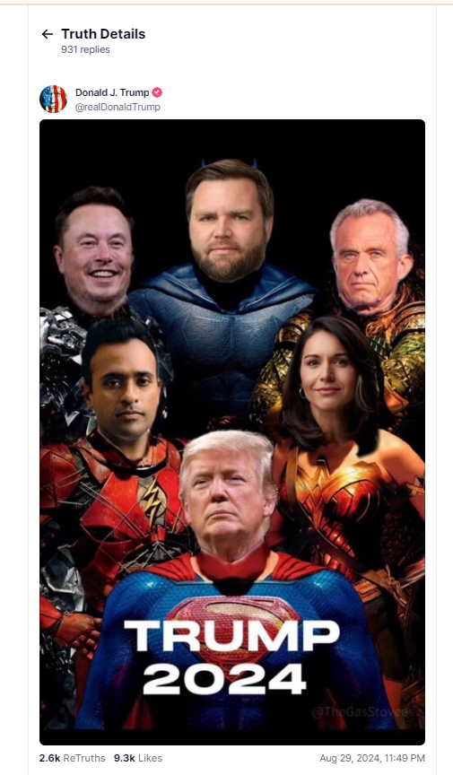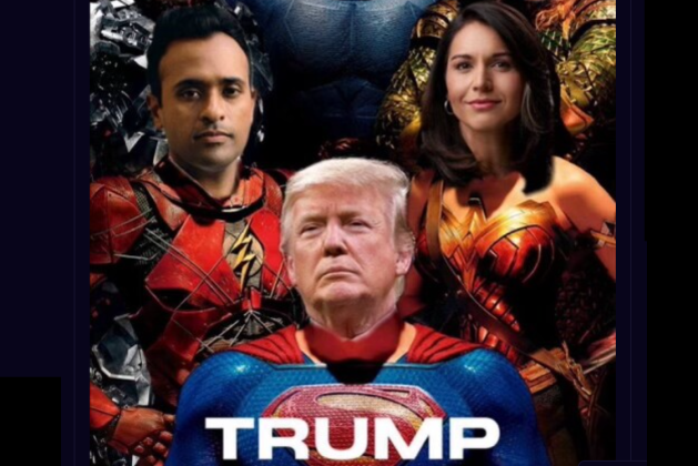 In addition, the tableau includes Elon Musk, the pro-Trump megabillionaire CEO of Tesla and SpaceX who owns X (formerly Twitter), as the part-human/part-robot Cyborg, and entrepreneur, investor and former presidential candidate Vivek Ramaswamy as the Flash. Former U.S. congressional representative Tulsi Gabbard is suited up as Wonder Woman, and Robert F. Kennedy Jr., who recently dropped his independent presidential campaign and endorsed Trump, seems to be Aquaman. The Trump 2024 campaign earlier this week announced the addition of RFK Jr. and Gabbard to its transition team.