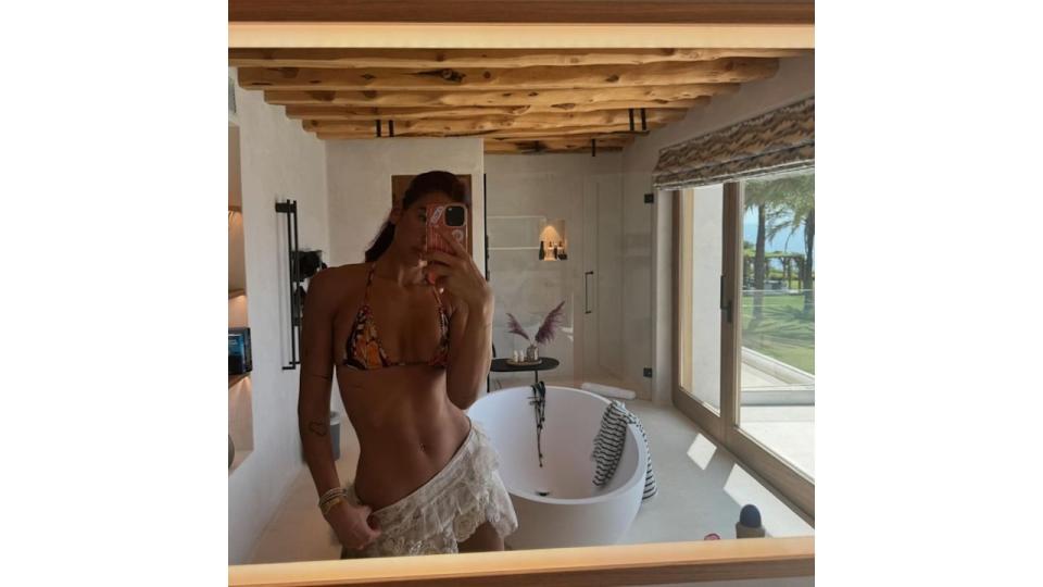 The younger Lipa sister looked equally summery in a red string bikini, letting her brunette locks flow past her shoulders in beachy curls.