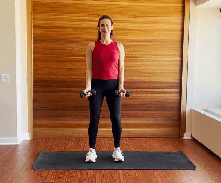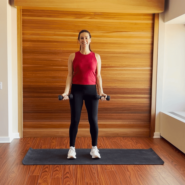 Stand with feet hip-distance apart. Hold a dumbbell in each hand. Allow your arms to rest at your sides, palms facing your body. Then, extend your arms straight out to the sides, up and away from your body to about shoulder height. Slowly return back to the starting position. Repeat for 10 repetitions.