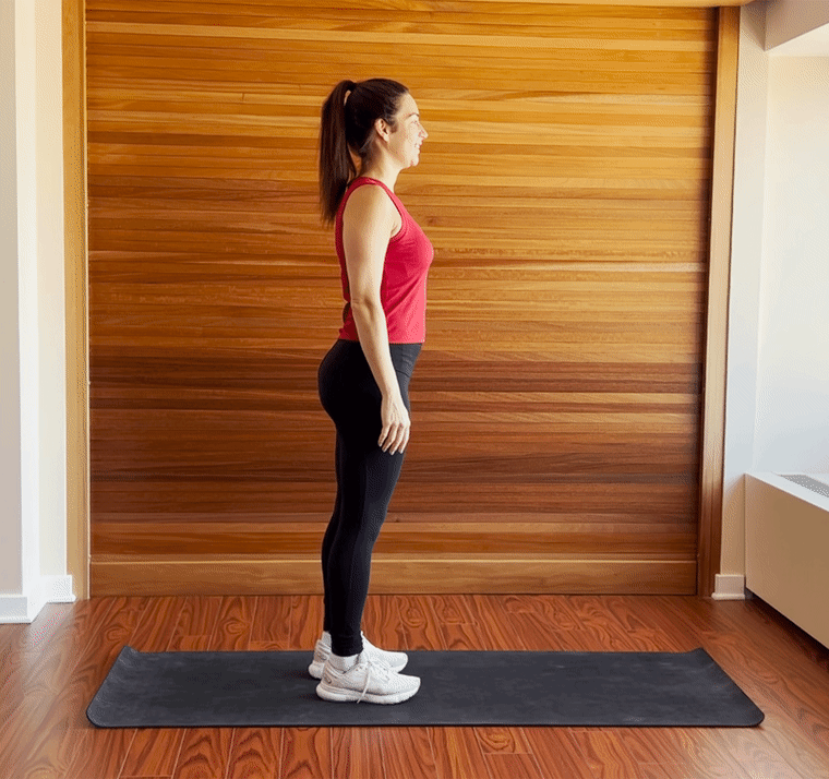 Start in a standing position with your feet hip-width apart and your core engaged. Squeezing your calf muscles, slowly raise your body, lifting your heels until you’re on your toes. Make sure to stand tall and straight. Then lower your heels back to the floor with control. Repeat 10 times.