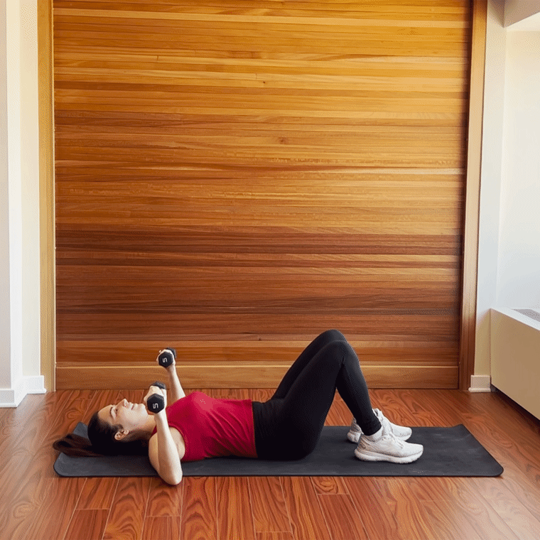 Begin lying on your back; hold a dumbbell in each hand. Open the arms out into a goal-post position, bending the elbows at 90 degrees. Exhale as you press the weights up, touching the weights directly over your chest with the arms extended. Then bring the arms back to the starting position and repeat 10 times.