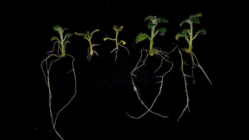 To test if tweaking this gene would affect nitrogen uptake, the researchers grew potato plants with a disabled StCDF1 gene in a low-nitrogen environment — about 400 times less than typical soil — and studied how they fared compared with normal potato plants. The StCDF1-deficient plants could not grow tubers, but they produced bigger leaves and longer roots despite the lack of nitrogen. “They looked happy,” says Shaikh.