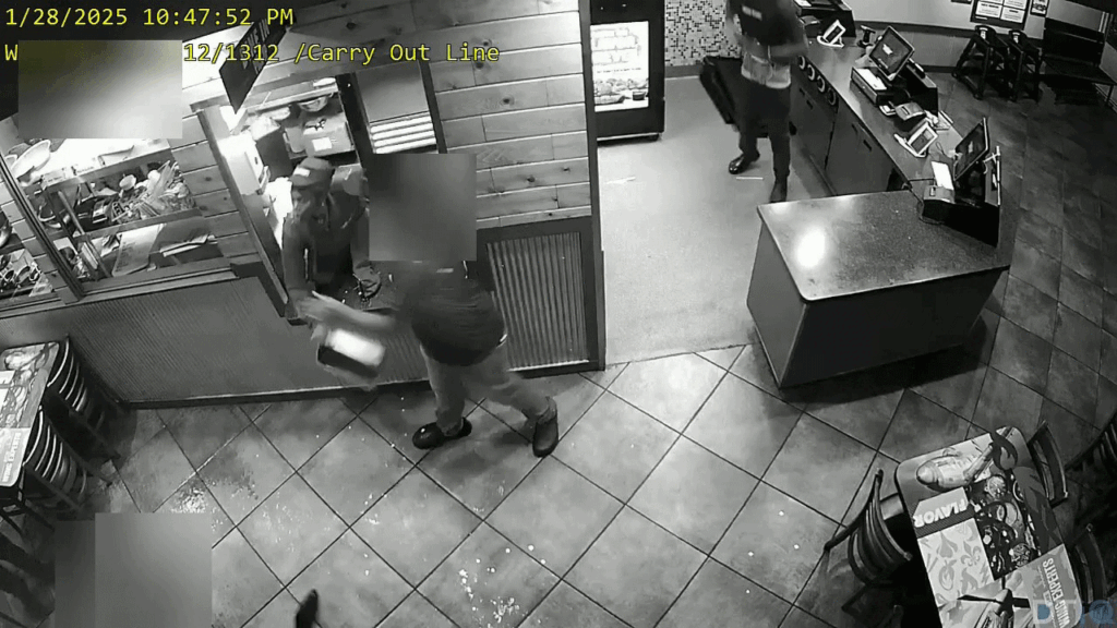 The incident took place on Jan. 28 and was captured on cameras inside the restaurant. The video does not have audio, so the verbal interactions cannot be heard.
