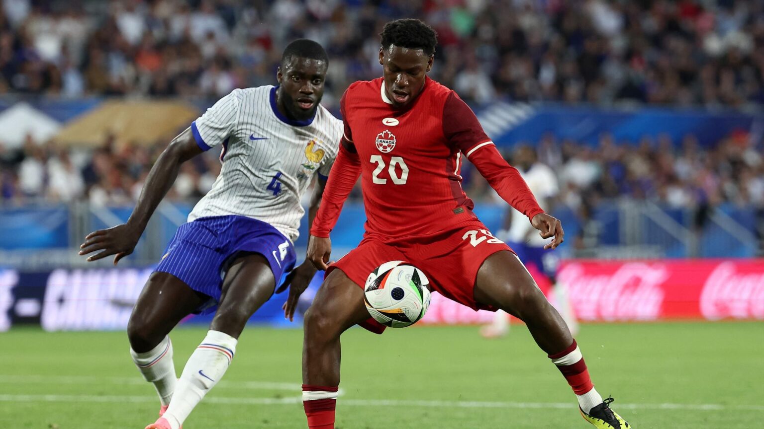 He crosses, Crepeau gets down … and palms the ball into the danger area … but there’s no one there to punish and Cornelius clears. And what’s this! Canada break with Millar and he steps inside Kounde to make an angle for a curler … and the Preston North End man power-curls against the bar! What an effort!