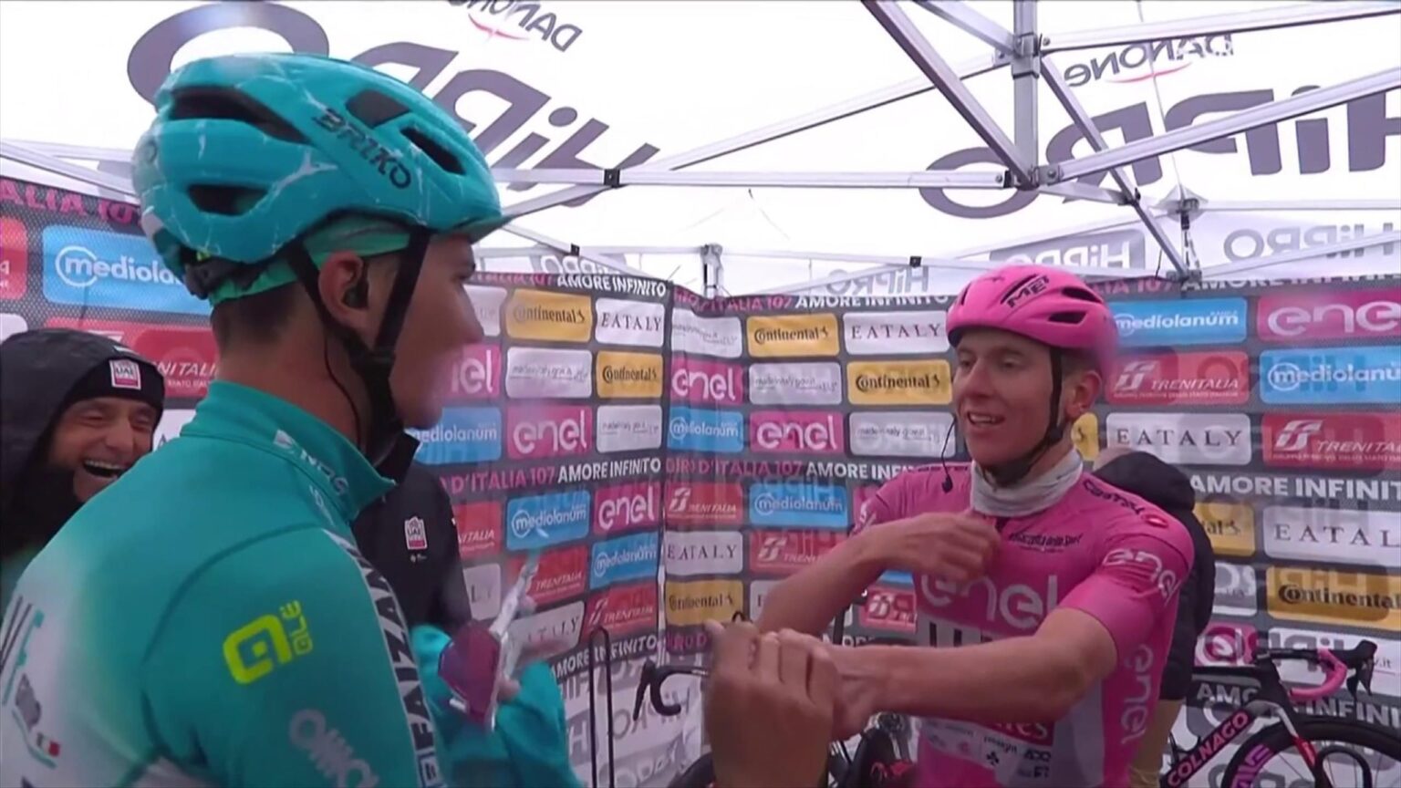 Giulio Pellizzari (Bardiani-CSF) may have seen Tadej Pogacar (UAE Team Emirates) end his hopes for a stage win at the Giro d’Italia, but he got a lovely consolation prize of a pink jersey and sunglasses courtesy of the Slovenian. Stream the cycling season, including the Giro d’Italia, live on discovery+