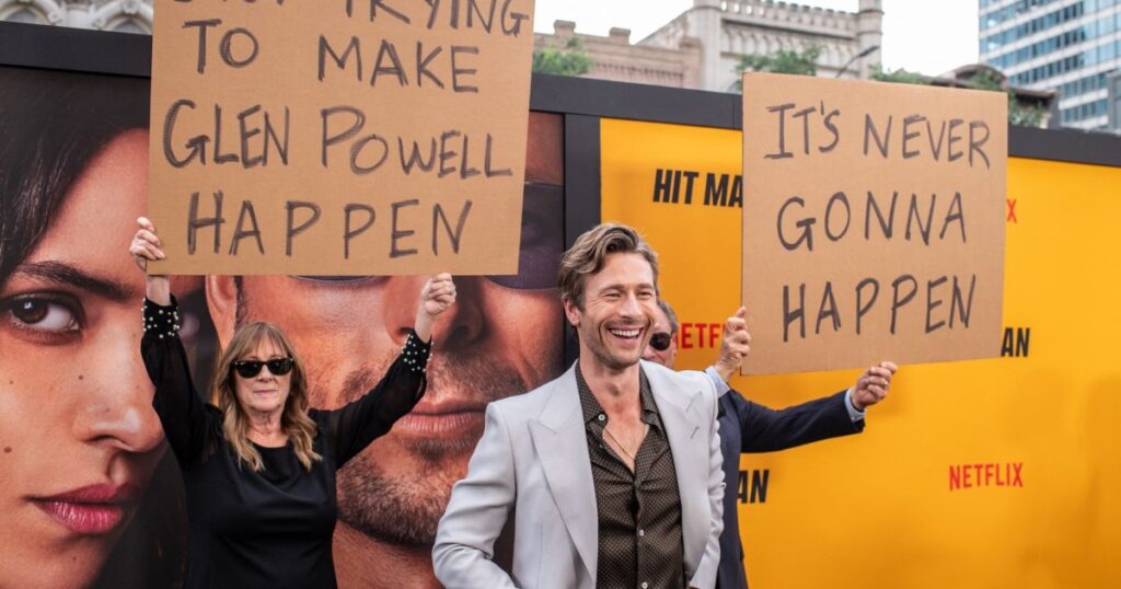 “Stop trying to make Glen Powell happen,” his mom’s sign read. His dad held up a sign that said: “It’s never gonna happen.”