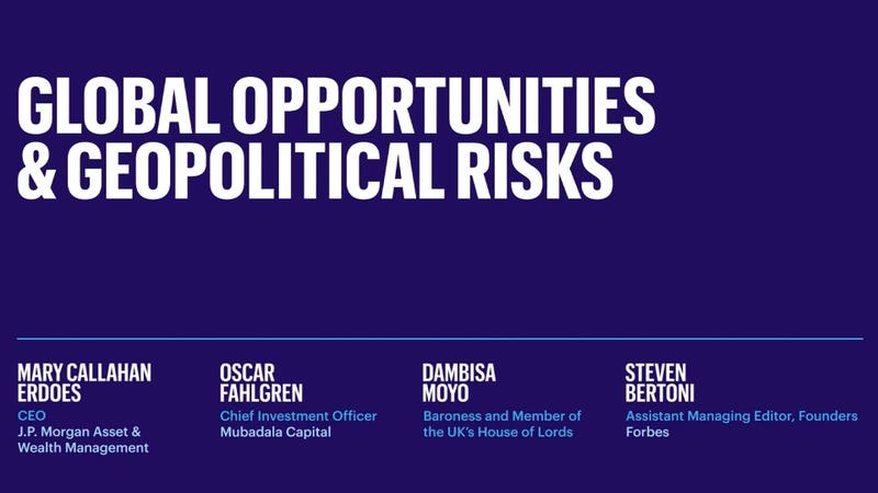 For the next conversation on Global Opportunities & Geopolitical Risks, with moderator: Steven Bertoni, Assistant Managing Editor, Founders, Forbes and panelists: Dambisa Moyo, Baroness and Member of the UK’s House of Lords and Co-Principal of Versaca, a family office Oscar Fahlgren, Chief Investment Officer, Mubadala Capital and Mary Callahan Erdoes, CEO, J.P. Morgan Asset & Wealth Management.