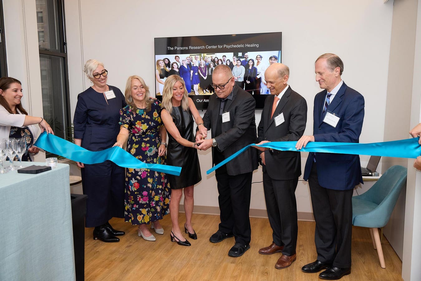 On the third floor of a Mount Sinai extension building in Manhattan’s Upper West Side, Bob and Renee Parsons grasp a pair of large scissors and cut a blue ribbon stretching across the room. As the two sides fall to the floor, an intimate audience of scientists, veterans, and United States politicians erupts into applause: The new location of the Parsons Research Center for Psychedelic Healing is open.