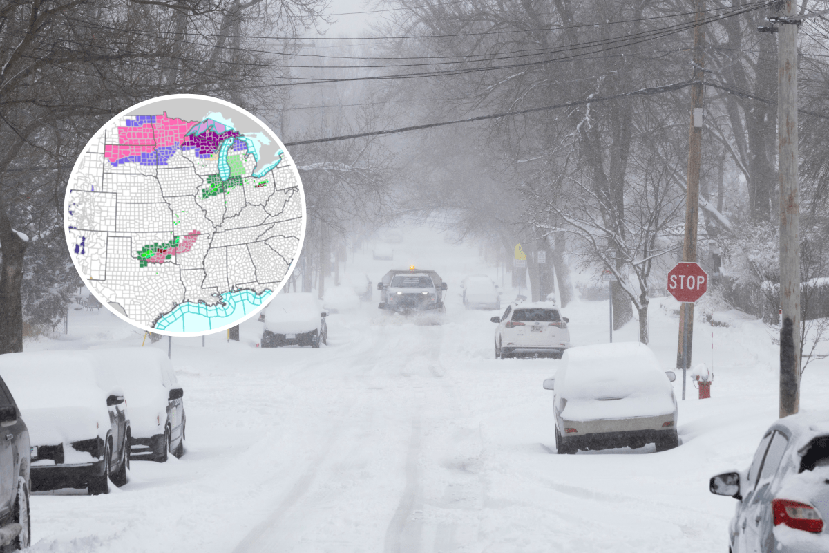 While Minnesota sees the deepest snow, ice storms are driving the highest risk across northern Michigan and northern Wisconsin, where freezing rain and sleet are expected to coat trees, power lines, and roadways.