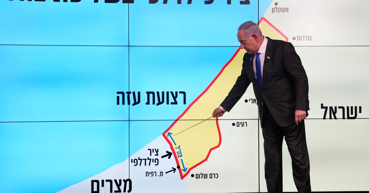 At a news conference on Monday, Netanyahu pointed to a map of the region depicting weapons flowing into Gaza from across the border, saying the corridor provided “oxygen” for Hamas.