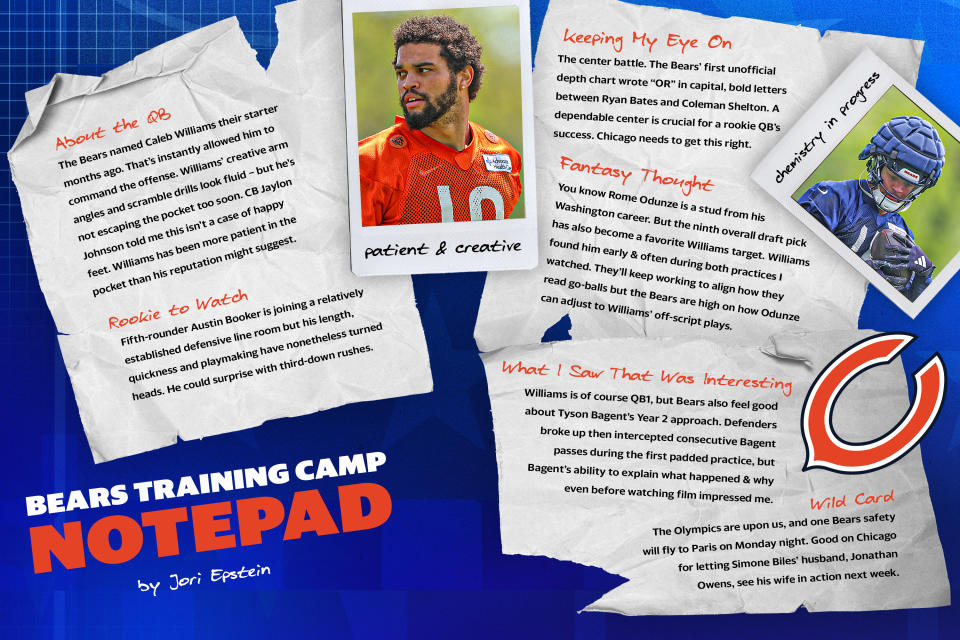 It’s not that Williams has completed every pass as he adjusts to a pro offense nor is that he’s already intuited each of his receivers’ tendencies on their go balls. Williams and fellow 2024 first-round pick Rome Odunze, for example, missed on some go balls in Thursday and Friday practices attended by Yahoo Sports. Odunze explained that he and Williams needed to better detail when he should expect the ball over the top and when it will be back-shoulder; when his route would primarily dictate the ball placement and when the defense may be showing Williams something that Odunze’s vantage point didn’t allow.