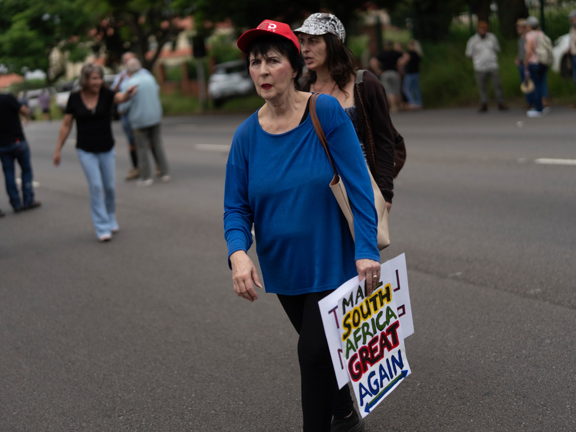 At the rally outside the US embassy, speakers urged attendees to “make South Africa great again,” echoing Trump’s Make America Great Again (MAGA) rhetoric.