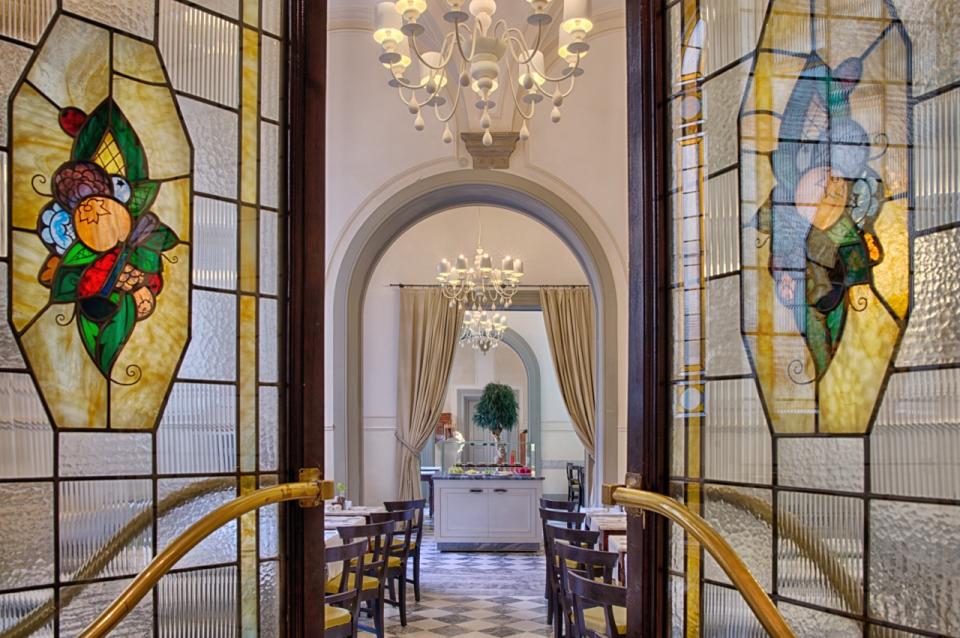 The moment you step into the lobby of NH Collection Firenze Porta Rossa, you feel like you’ve time-traveled into a regal moment in history. The grand lobby features checkered marble floors, striking red velvet furniture, pillared archways, and a magnificent ceiling adorned with stained glass and antique frescoes. Lingering in this lobby is akin to stepping into a Renaissance painting. From the elegant decor to the timeless colors, every detail nods to Florence’s artistic splendor.
