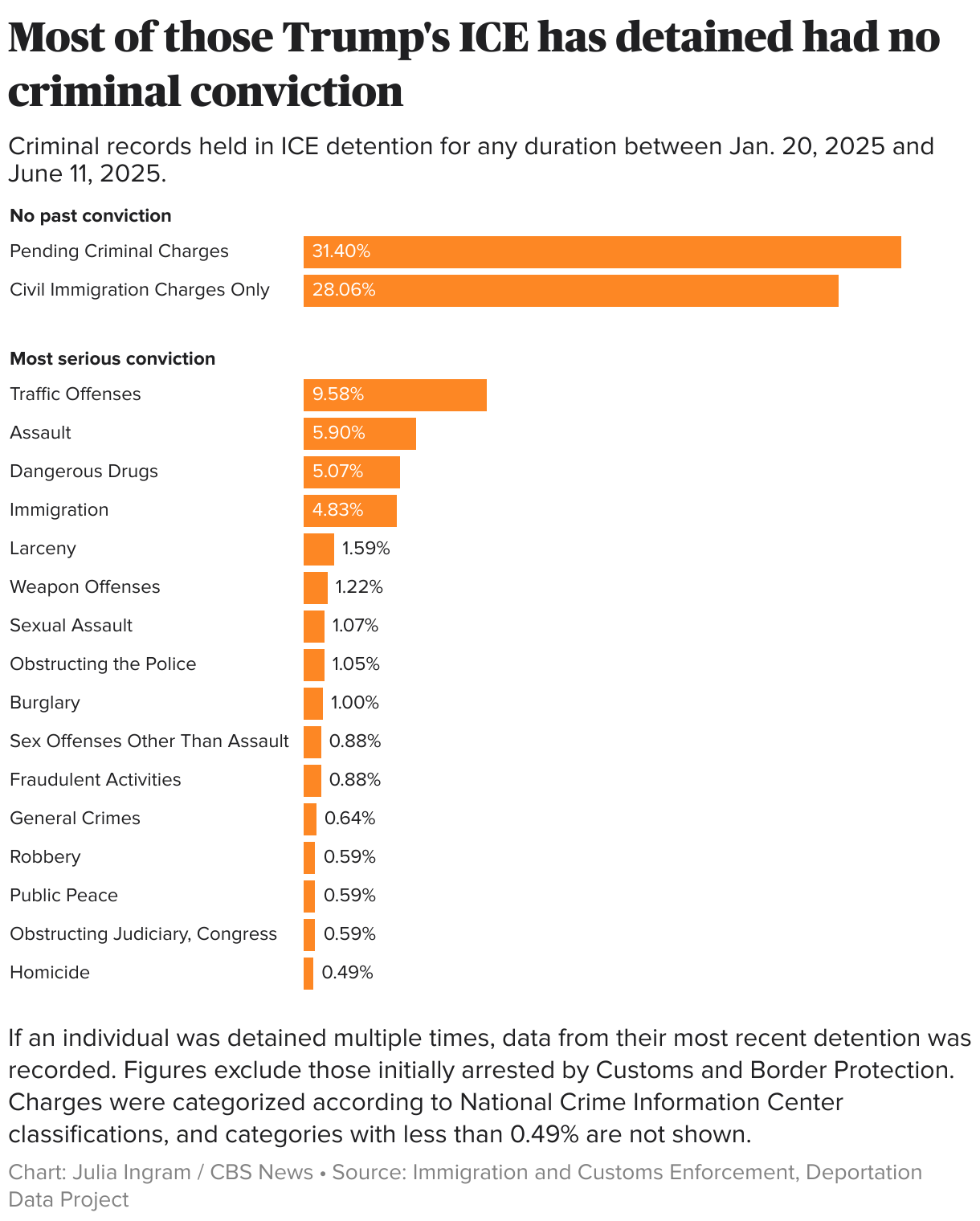 But even among those with criminal convictions — about 40% of detainees since Jan. 20 — the majority were not for violent offenses. Overall, roughly 8% of all detainees had been convicted of violent crimes, CBS News found.