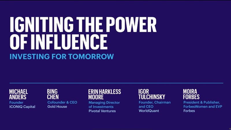Igniting The Power of Influence: Investing For Tomorrow with moderator: Moira Forbes, President and Publisher, ForbesWomen and EVP, Forbes and panelists: Igor Tulchinsky, Founder, Chairman & CEO, WorldQuant, Erin Harkless Moore, Managing Director of Investments, Pivotal Ventures, Bing Chen, Cofounder & CEO, Gold House and Michael Anders, Founder, ICONIQ Capital.