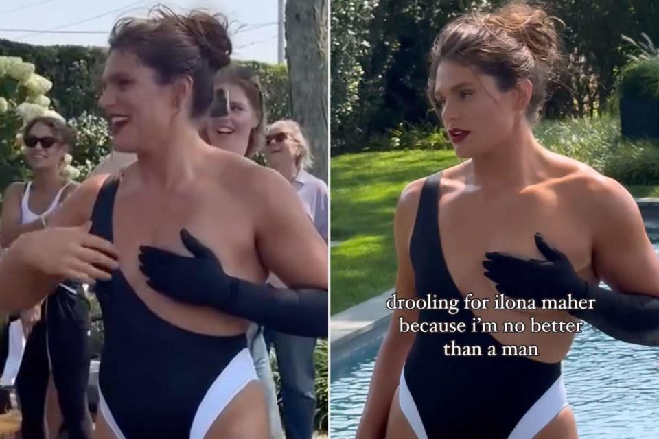 On Sept. 3, Maher posted a behind-the-scenes clip of her greeting crew members while wearing a black one-piece with a neckline so low it exposed one side of her chest.